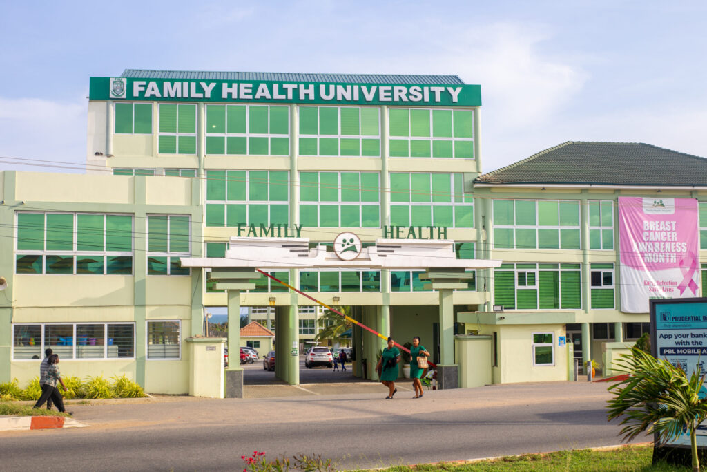 Family Health University, honoured with the prestigious Presidential Charter, started in a garage at 51 Guggisberg Street, Korle Bu in 1997 as a Diagnostic Centre, and was later moved into a rented premise at Zoti Road as Family Health Hospital. In 2007, it was relocated to its permanent site at Teshie, overlooking the Atlantic Ocean and directly opposite the Kofi Annan International Peace Keeping Training Centre. As the hospital expanded, the need to train its own health personnel saw the establishment of the Nursing and Midwifery School in 2009.